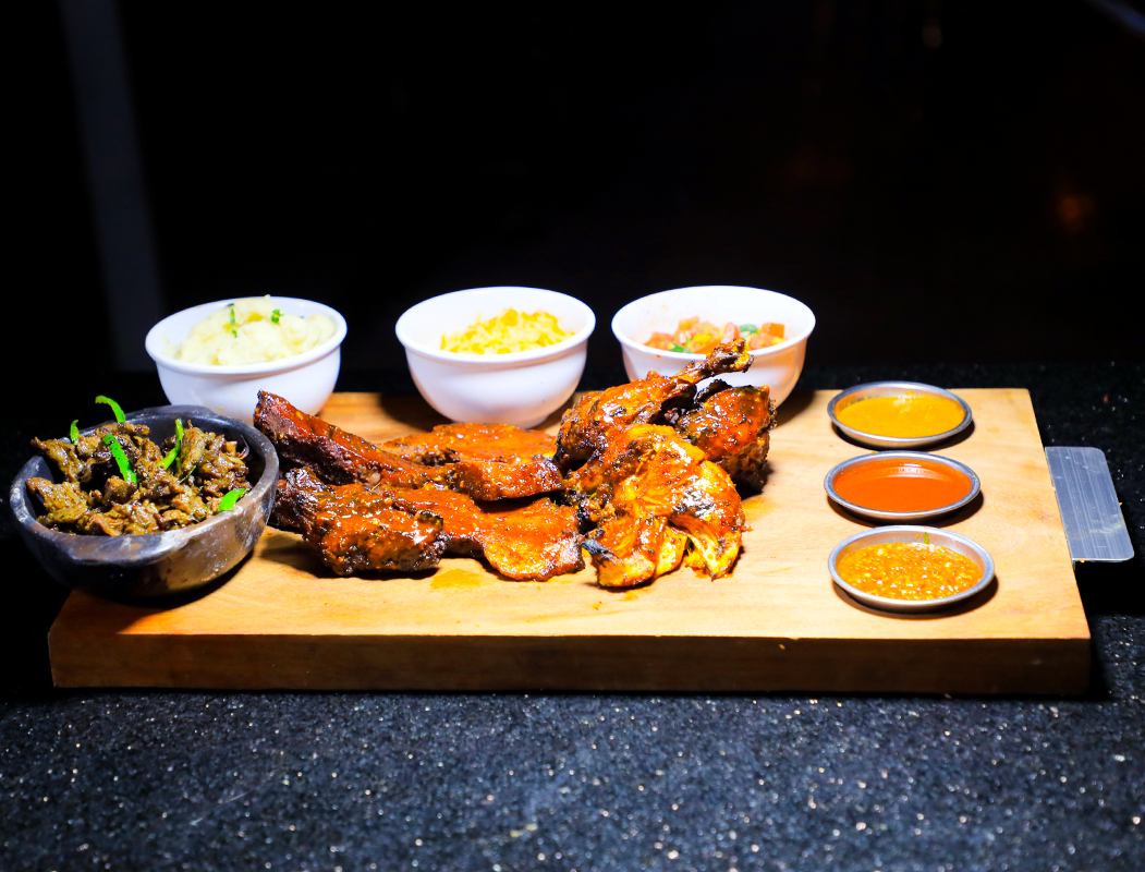 A collection of half chicken, beef roast, grilled tibs, beef kebab, dessert and 3 slide dishes.