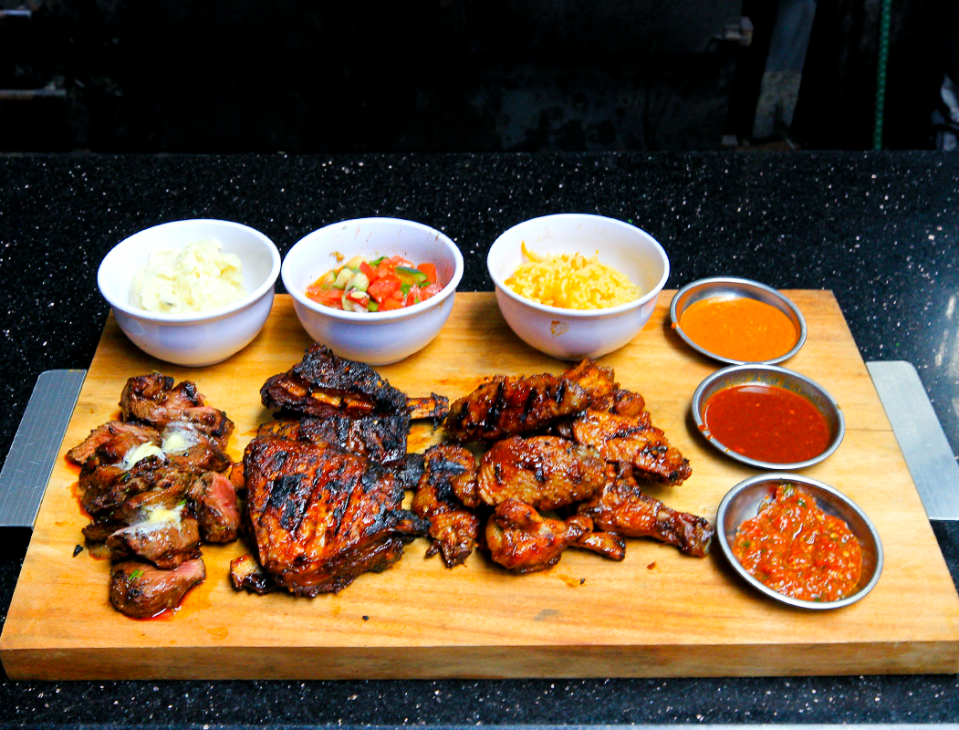 A collection of grilled, steak's, smoked chicken, and grilled nileperches.
